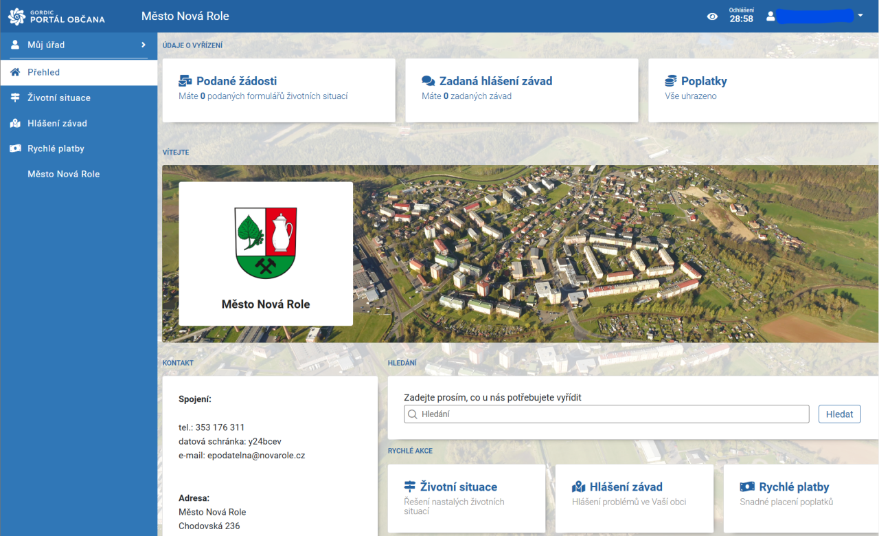 Po přihlášení občana prostřednictvím jedné z digitálních identit občana, viz předchozí článek, se uživateli zobrazí tato obrazovka, která obsahuje rozcestník s nejčastěji použitými funkcemi, jako je přehled o žádostech podaných prostřednictvím portálu, hlášení závad, stavu úhrady místních poplatků a další.