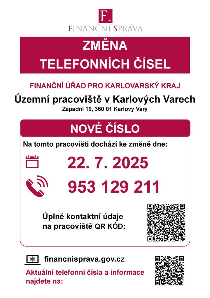 Finanční úřad pro karlovarský kraj od 22.7.2025 mění telefonní číslo na 953 129 211. Více informací na obrázku.